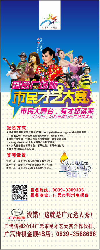 这个夏季,谁最火!没错,这就是广元达人秀!广汽传祺2014广元市民才艺大赛合作伙伴。买好车到广汽传祺广元金顺4S店:0839-3568666.只要您有才艺马上参加广元的达人秀:0839-3309335.秀出您的才艺吧!亲。活动期间购传祺车型,可以获得购车补贴1000元哦!